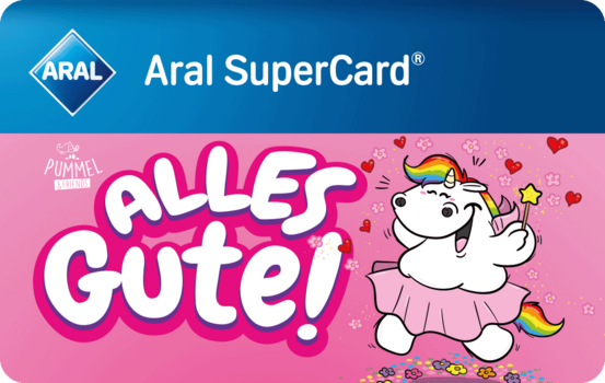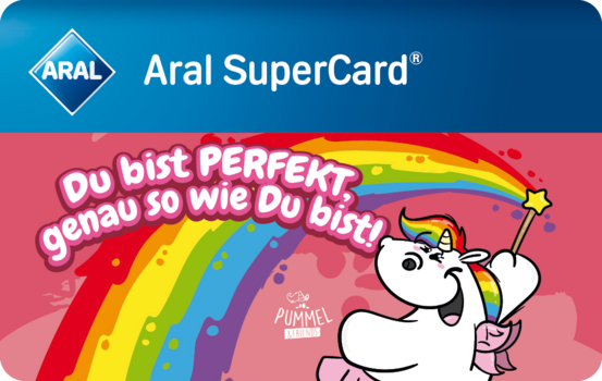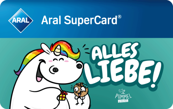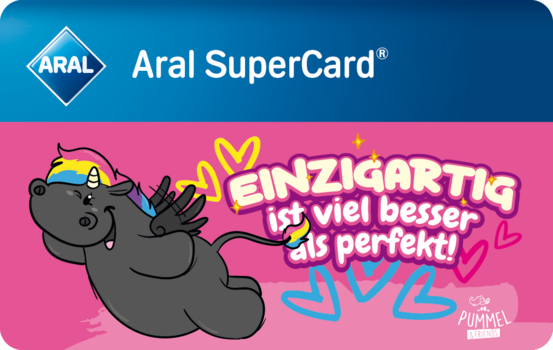 Die Aral SuperCard in der flauschigen Pummeleinhorn-Edition! Einlösbar für Aral Kraft- und Schmierstoffe, Shopware, Autowäschen und im PetitBistro. Deutschlandweit an allen Aral Tankstellen gültig.